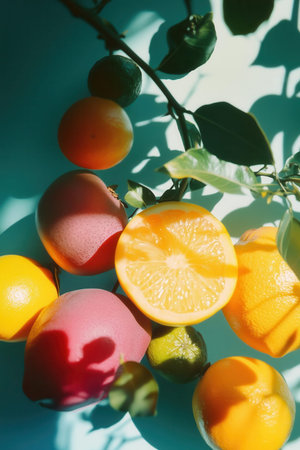 An arrangement of citrus fruits and glass bottles filled with refreshing beverages, displayed in bright sunlight. The shadows and vibrant colors create a lively, fresh atmosphere.