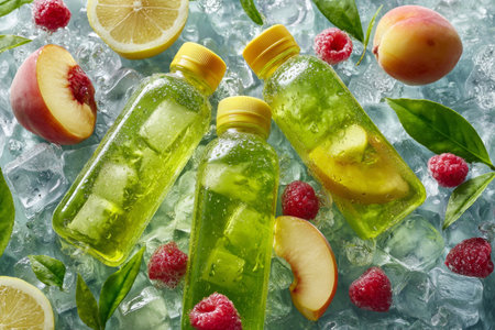 Three smooth green plastic tea bottles with yellow caps rest on tea leaves. Frozen raspberries, lemon slices, and peach slices add color among ice cubes.