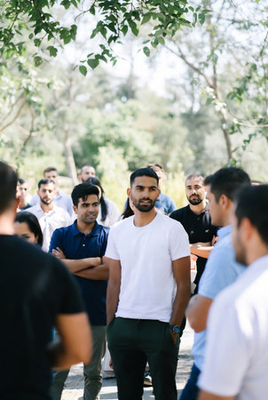 A photo featuring a gathering of men standing next to each other in a unified pose, Men greeting each other after prayer, AI Generated