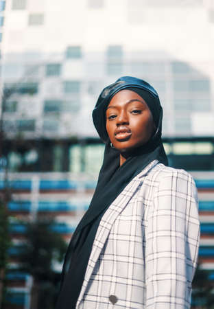 african muslim woman with a beautiful smile takes a selfie with a cell phone