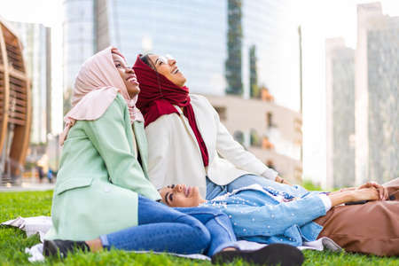 Multiethnic group of muslim girls wearing casual clothes and traditional hijab bonding and having fun outdoors - 3 arabic young girls