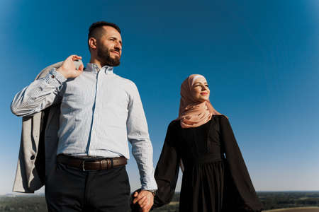 Muslim love story on the blue sky background. cheerful mixed couple smiles and hugs. Woman weared in hijab looks to her man. Advert for on-line dating agency