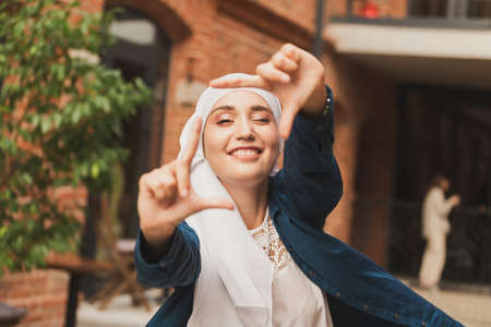 Portrait of young muslim girl making a camera frame with fingers outdoors.