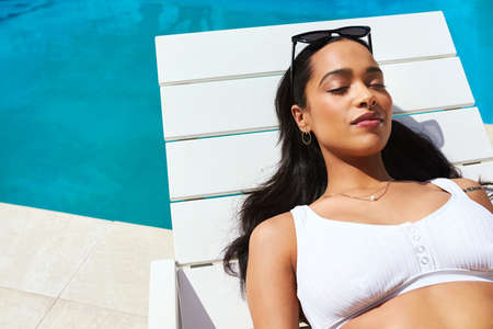 Summer is the most chilled season of the year. Cropped shot of a beautiful young woman relaxing on a lounger by the poolside.