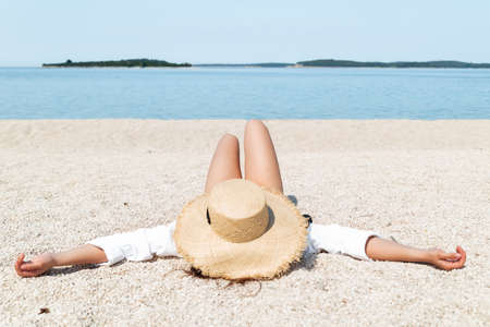 Young woman in straw hat relaxing on the beach on a sunny day