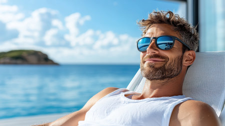A man sunbathing on deck chair, wearing sunglasses, enjoying view