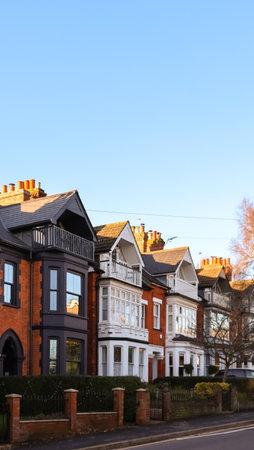Row of Victorian and Edwardian style suburban houses with bay windows and balconies lining a residential street on a clear day