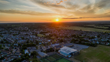 Aerial view of Hoddesdon, Hertfordshire showing river, sunset and housing estate