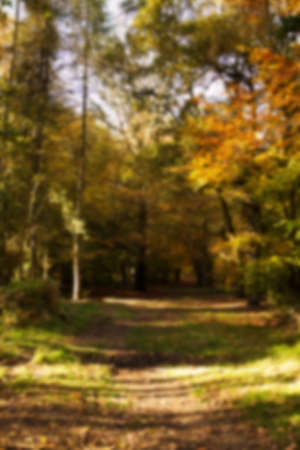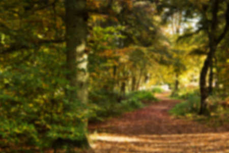 Woodland scene with autumn leaves in yellow and brown Out of focus.