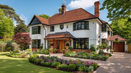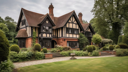 tudor house exterior, with view of the surrounding garden and fountain, created with generative ai