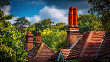 The image features a view of multiple chimneys constructed of red brick, rising above a terracotta tiled roof. The composition includes a backdrop of lush green foliage and a vibrant blue sky with scattered clouds. Suitable for use in architecture, real estate, and landscape projects.