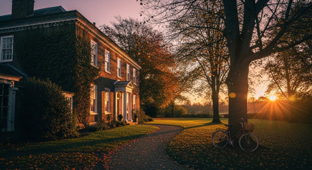 A panoramic image of a beautiful English country house in autumn