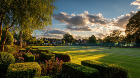 Experience the beauty of a tennis court bathed in the warm glow of sunset, surrounded by lush greenery and vibrant flower beds, inviting relaxation and leisure.