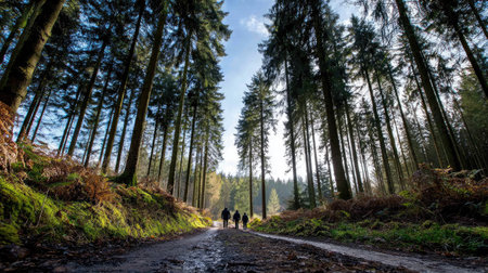 A group of people walking on a path in a forest with sunbeams