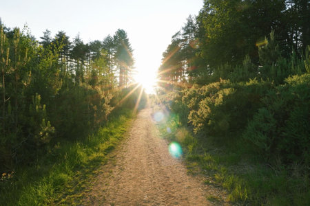 Sunset in the pine forest. Beautiful summer landscape with road and trees