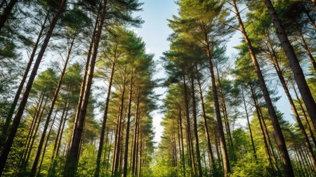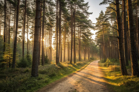 Serene forest scene featuring tall, straight pine trees with sunlight filtering through branches, creating warm and inviting atmosphere. vibrant colors of nature evoke sense of peace