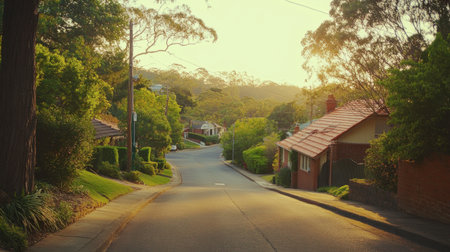 Suburban Homes at Sunset with Lush Greenery and Scenic Landscape.