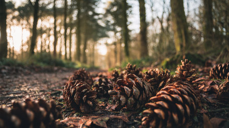 A serene forest pathway adorned with pine cones and fallen leaves, enhanced by soft morning light. Experience the tranquility of nature on this beautiful trail.
