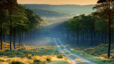 Sunlit Golden Hour Dirt Road Through a Misty Forest Landscape, Scenic Nature Trekking Path