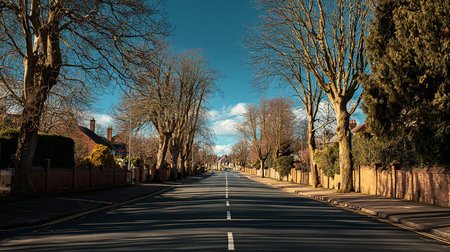 Long path with lamp posts and trees on both sides in a quiet suburban area