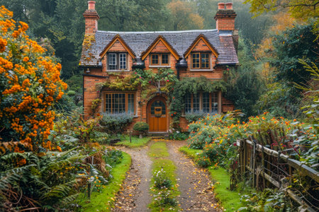 Charming English Cottage Surrounded by Autumn Foliage.