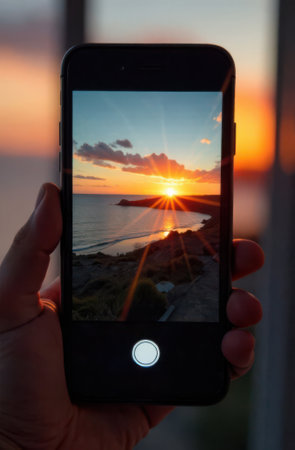 a person taking a photo of a stunning sunset over the ocean with a smartphone, highlighting mobile photography and natural beauty.