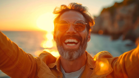 Happy man taking selfie at sunset