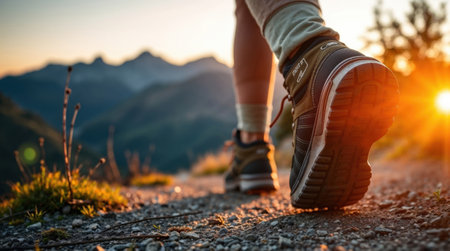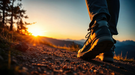 close-up of hiking boots on a trail at sunset