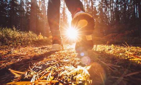 Rear view photo of female tourist legs with sneakers walking in a forest road.Summer day sunshine.Selective focus.Soft focus.