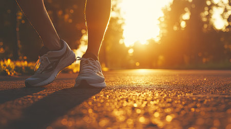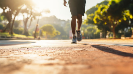 A low-angle shot capturing the silhouette of a person's legs walking briskly along a paved path during a vibrant golden sunrise. Dust particles float in the warm backlighting while the subject wears sneakers, symbolizing an active morning routine and determination.