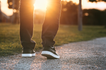 Close up of male legs in sneakers walking on asphalt road during sunset
