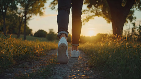 A closeup, lowangle shot of an individual walking on a treelined path, their sneakers framed by sunlit grass, capturing the peaceful ambiance of morning exercise