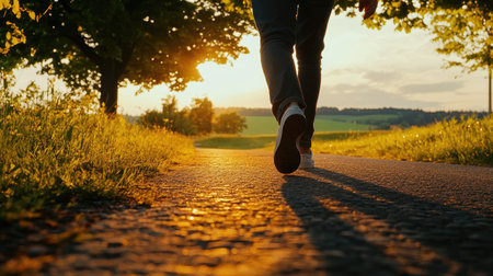 A close-up of the legs and shoes of an adult man walking along a country road, captured from behind with a low-angle view at sunset. The focus is on his black jeans and white sneakers as he walks towards us in the distance. In front of him lies a green meadow, and trees line both sides of the path. Warm, golden sunlight bathes everything around it. --chaos 30 --ar 16:9 --v 6.1 Job ID: 1c06b93d-2f3a-47b7-b475-27fb96503b2f