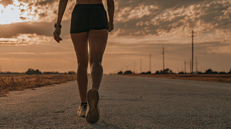 close up, young fitness woman legs walking at road. Fitness and workout wellness concept. sunrise light
