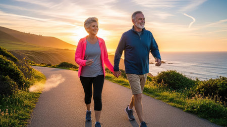 An elderly couple is depicted walking along a coastal road, holding hands. The scene features warm, golden sunlight and a clear sky, highlighting the silhouettes of the figures. Lush greenery borders the pathway, contrasting with the cool tones of the ocean. This image is suitable for illustrating themes of companionship and retirement.