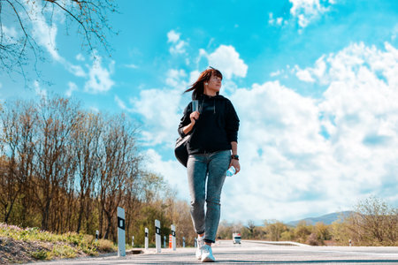 A young pretty woman walks along the countryside road with a backpack in her hands. Concept of hitchhiking and local travel.