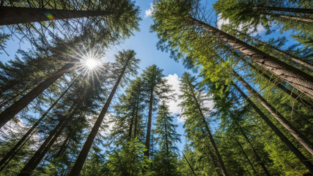 Sunlit canopy of towering evergreen trees