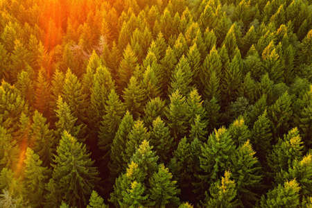 Aerial view on pine forest lit by sunset sun rays. Beautiful pine forest shot with a drone