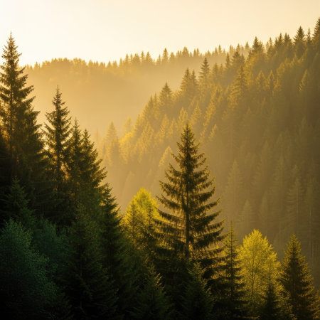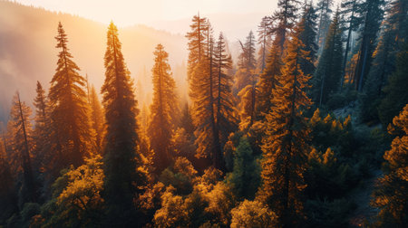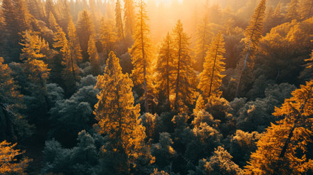 An aerial view presents a dense forest, featuring tall evergreen trees under warm sunlight. The image showcases variations in green foliage, enhanced by a hazy atmosphere. This scene is suitable for use in travel articles, environmental campaigns, or as a serene backdrop for design projects. The composition emphasizes natural beauty.
