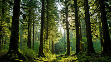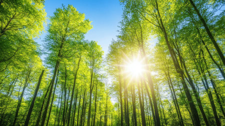 A forest scene features tall trees with vibrant green foliage illuminated by sunlight. The composition includes a path leading into the distance. The image showcases a natural setting with various shades of green and a bright light source. This visual could be used for environmental, travel, or nature-related projects.