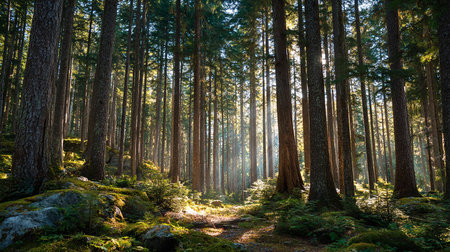 Sunlight streams through tall pine trees in a peaceful forest, illuminating the lush greenery and creating a serene atmosphere.