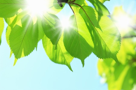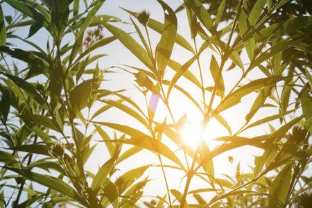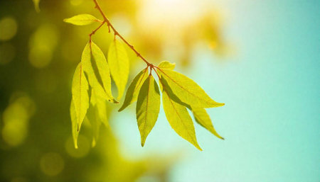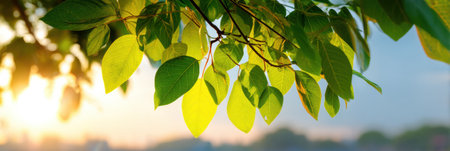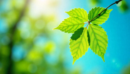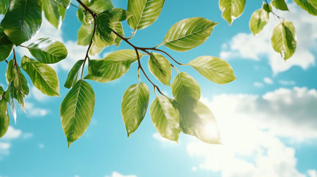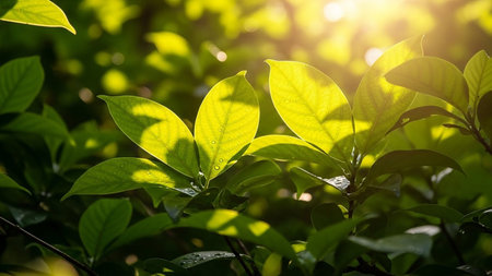 Bright green leaves illuminated by sunlight in a serene outdoor environment during a clear day