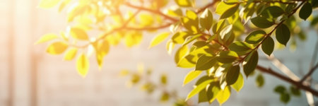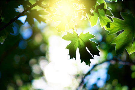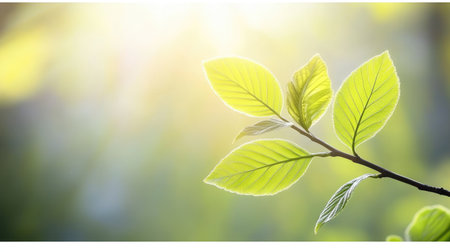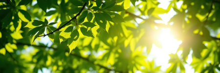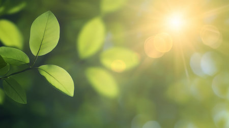 Luminous Green Leaves with Sunlight Creating a Gentle Bokeh Background for Graphic Designs and Text