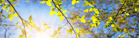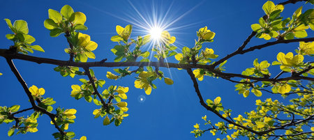 Sparkling Spring Sunshine on Vibrant Yellow Blossoming Tree Branches Against an Azure Sky