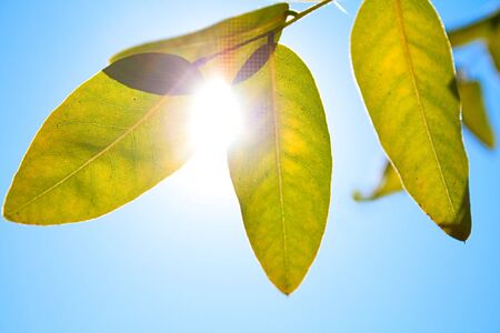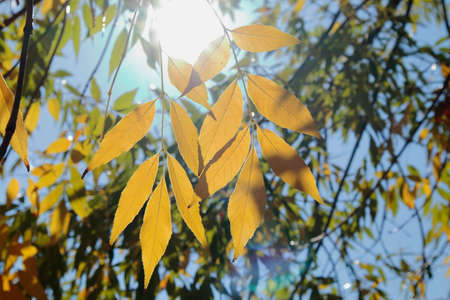 Sunlight shining through yellow leaves against the sky. Popular autumn colors of the year.