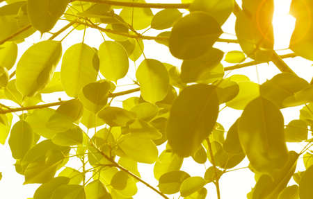 Leaves of a Bodhi tree shine brightly under the warm glow of sunrise, creating a tranquil ambiance in the early morning light.
