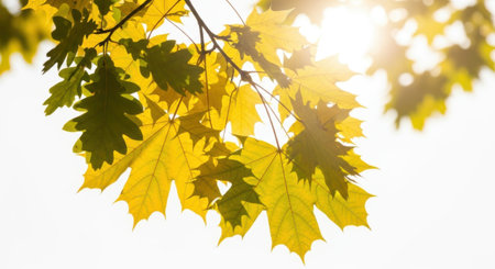 A close up of vibrant yellow maple leaves with sunlight shining through them, isolated on a white background.