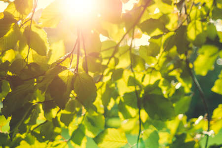 Beautiful, fresh, green leaves in the summer sunlight. Vibrant forest scenery of Northern Europe.