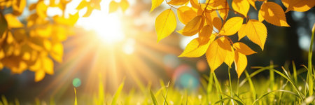 Bright sunlight filters through vibrant yellow leaves in a serene natural setting during a sunny autumn afternoon