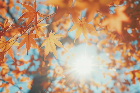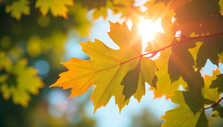 Sunlight illuminating vibrant autumn leaves on branches in forest